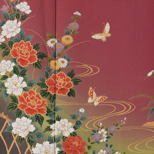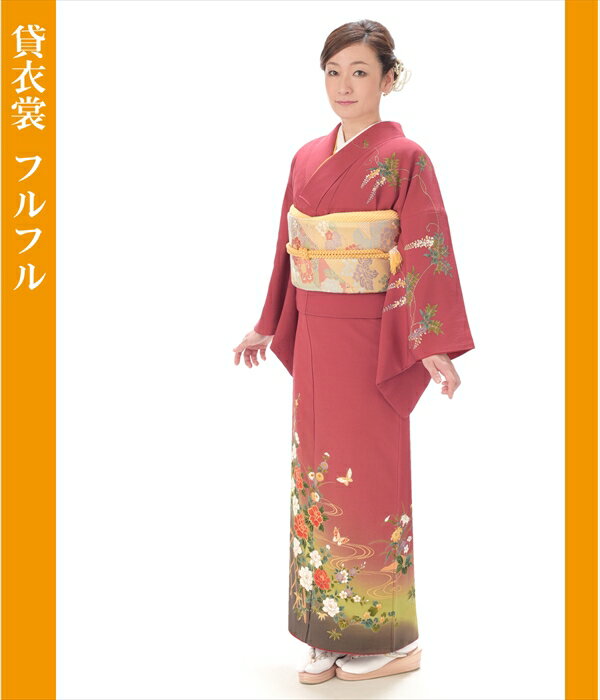 ◆ 【2020年】 10/8〜10/22(ご予約済み) 11/15〜11/29(ご予約済み)【訪問着・付下げレンタル】 さび朱小川の花 写真(上)前アップ(下)衣裄 ※ 商品の色については画面を表示するモニターによって実際と多少異なる場合がございます。